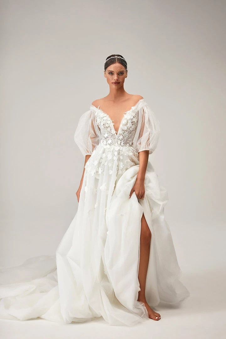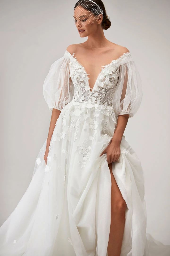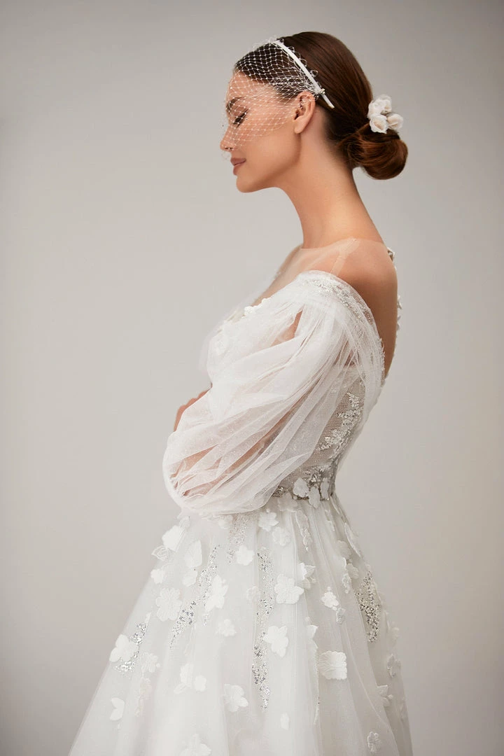 Wedding gown in ivory with a V-neckline adorned with sparkly lace bodice and detachable bishop sleeves.