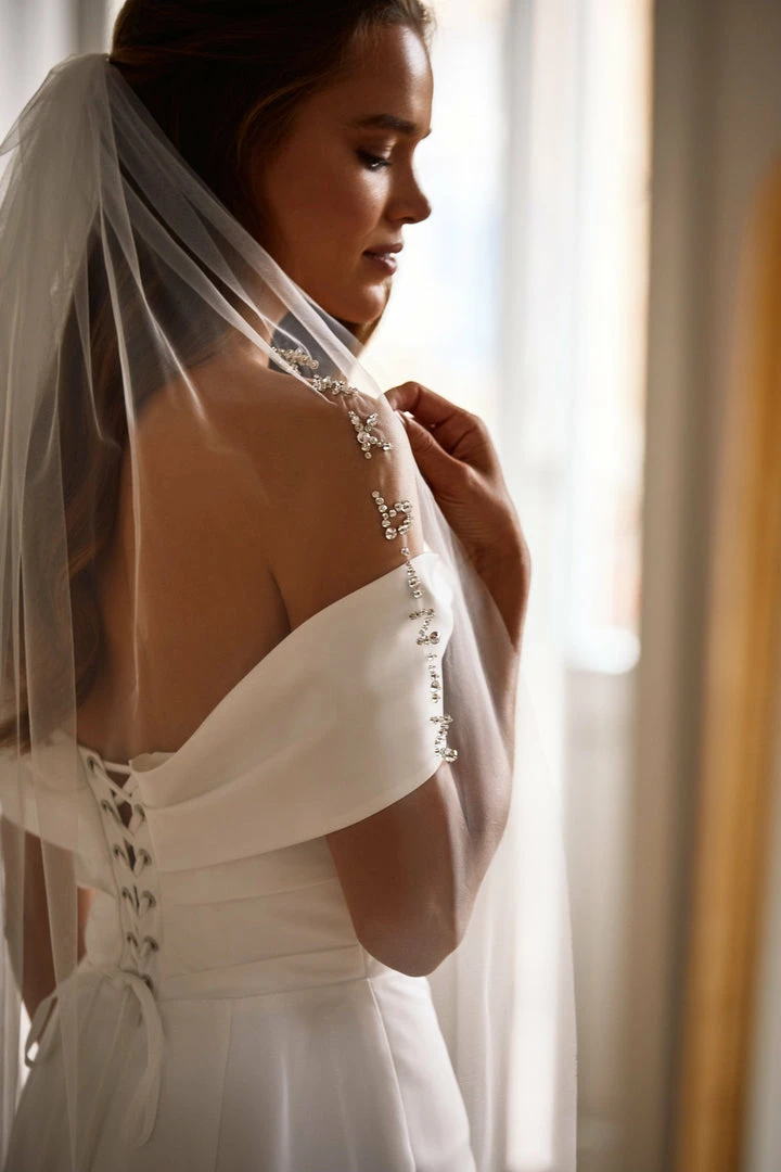 Tulle veil with crystal beading (Aşk Biziz). Delicate beading with silver trim. Designed in a high bow’s manner covering the hairstyle.