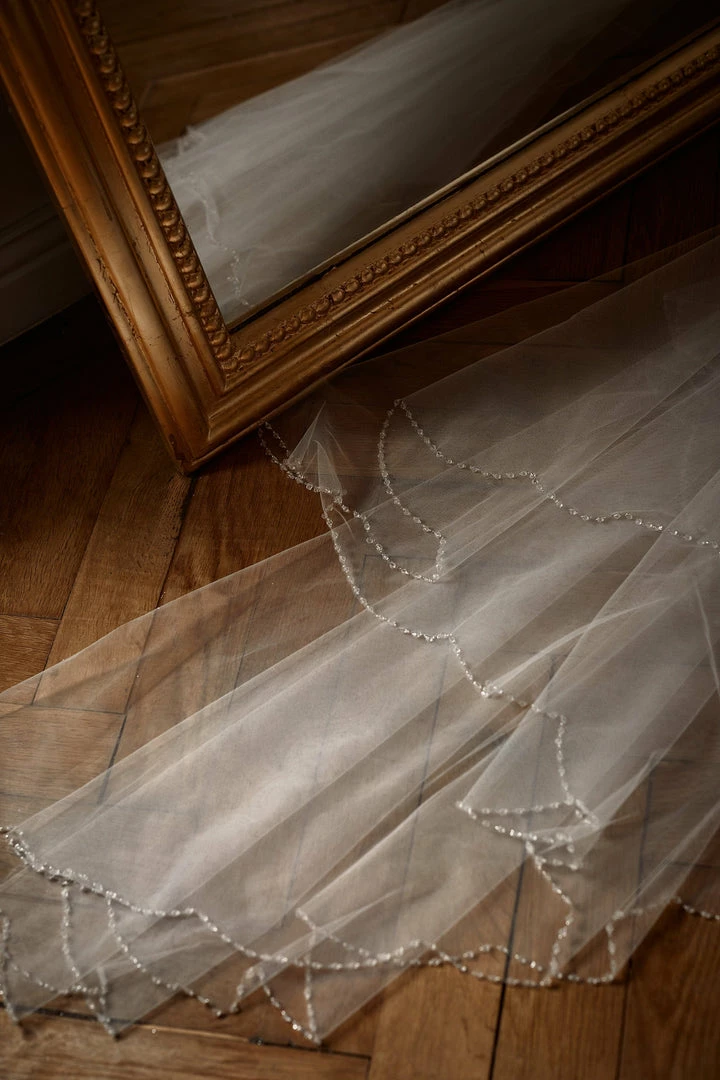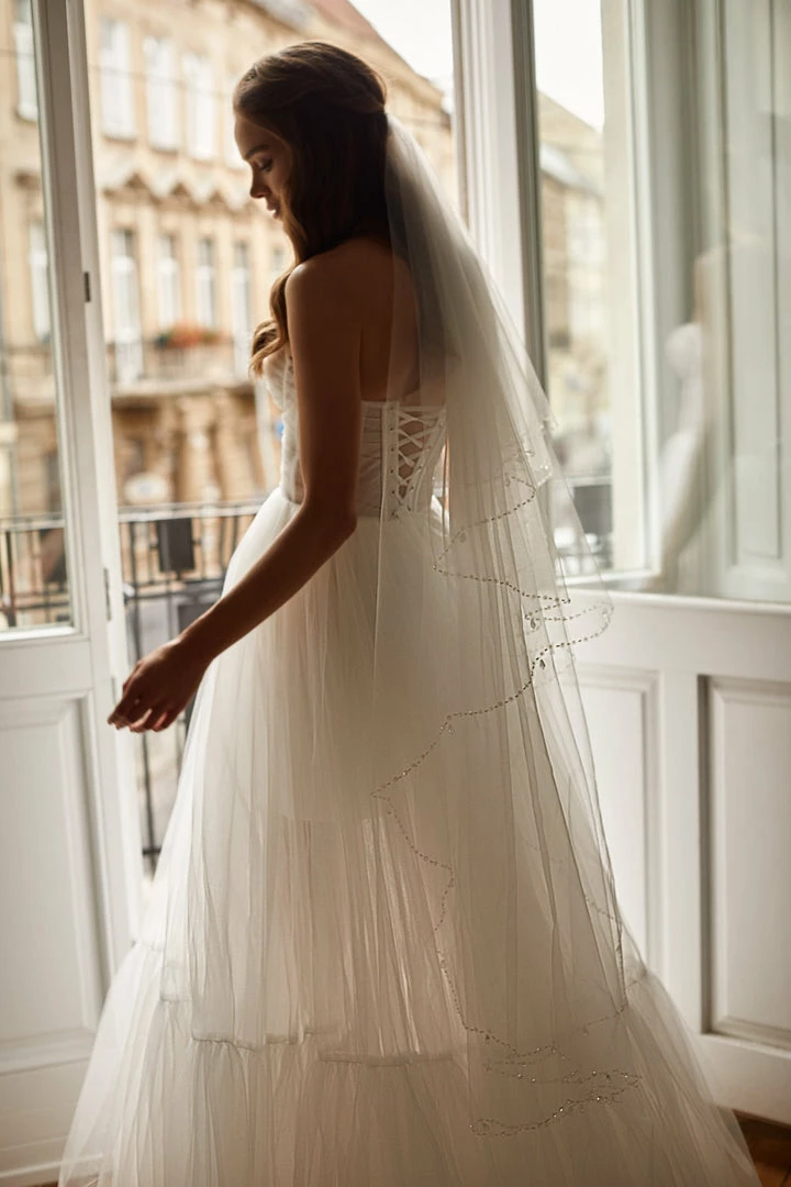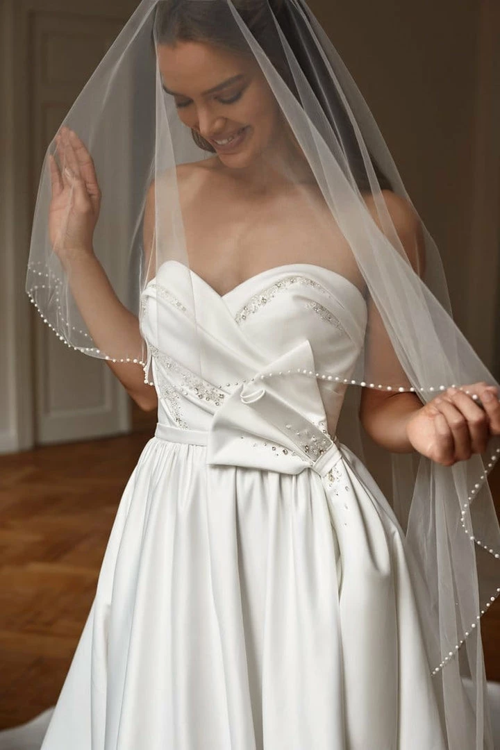 Romantic simple tulle veil with the blusher. Choose your favourite style – pearls or crystals, you can also choose crystals and pearls together!