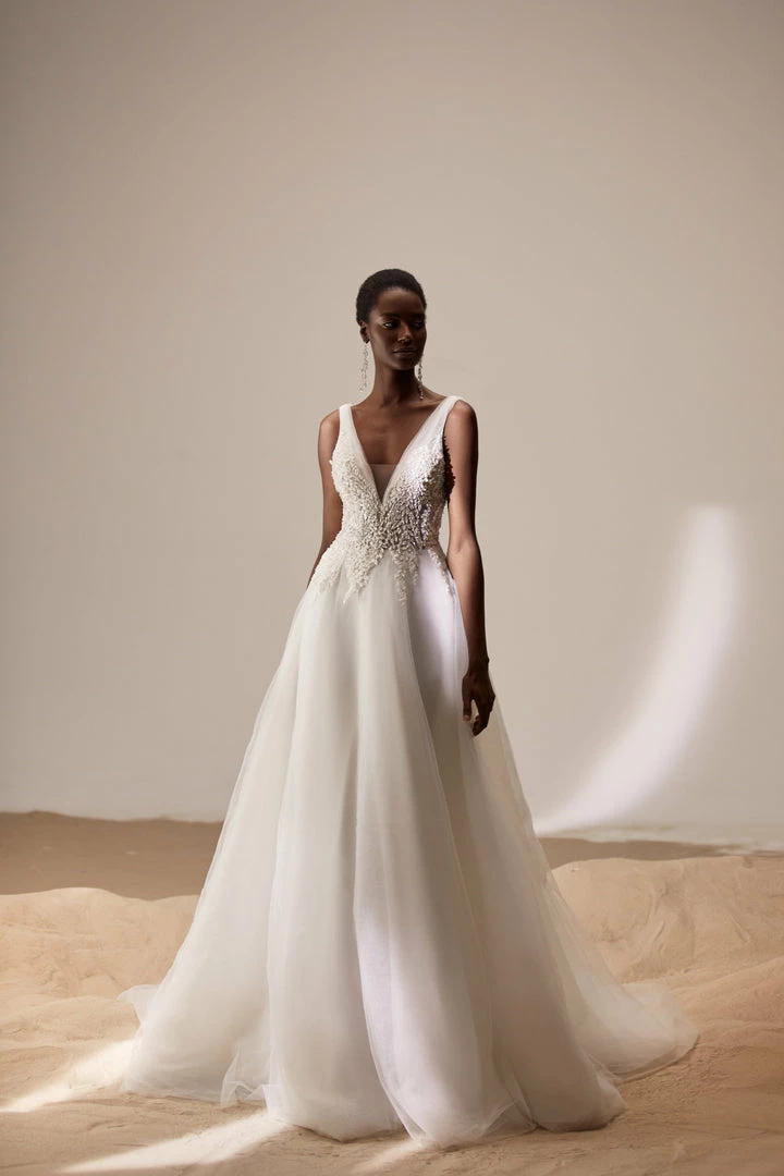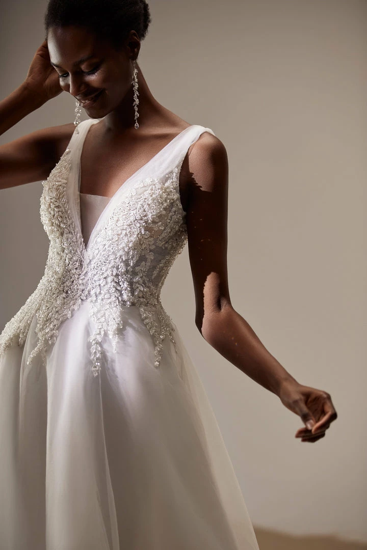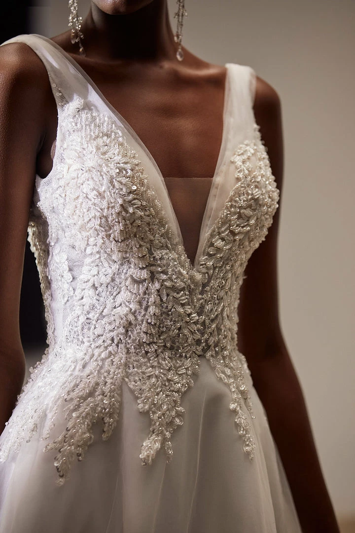 A-line wedding dress with open back and V-neckline adorned with beaded lace appliques on the corset.