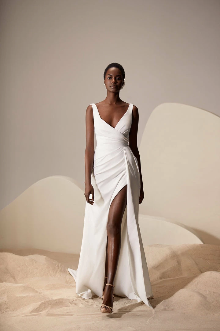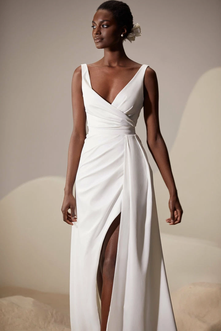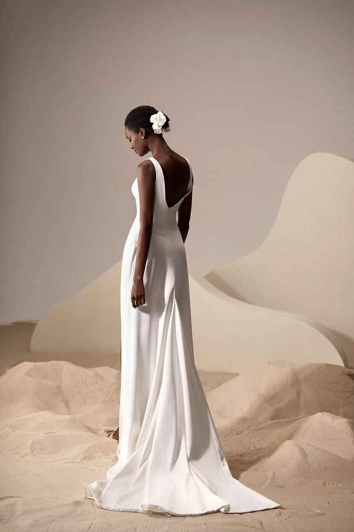 Wedding dress in satin with wide stripes, open back, V-neckline, and a slit.